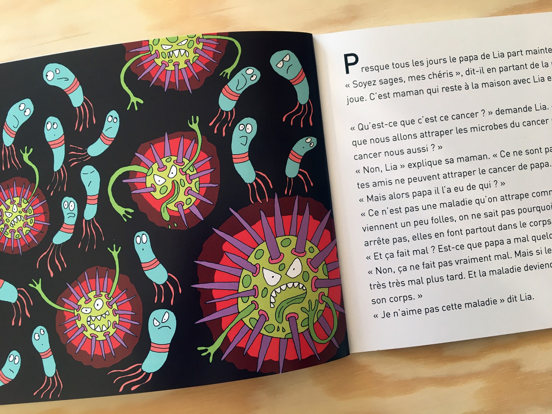 La configuration familiale, qui est malade, la fratrie, le type de cancer, le type de traitement, la langue et le style d’illustration (Walder Johan, Tom Tirabosco ou moi-même).