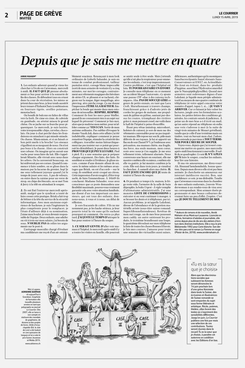Alors que les discriminations sociales que subissent les femmes seront dénoncées le 14 juin 2019 lors d’une grève féministe dans toute la Suisse, des écrivaines et illustratrices de Suisse romande se sont emparées du sujet sous forme littéraire et artistique. Récits, poèmes, théâtre, elles livrent des textes où s’expriment des sensibilités différentes. Le Courrier publiera une fois par mois une sélection de ces contributions. Toutes seront réunies dans le recueil Tu es la sœur que je choisis, en coédition avec les Editions d’en bas.